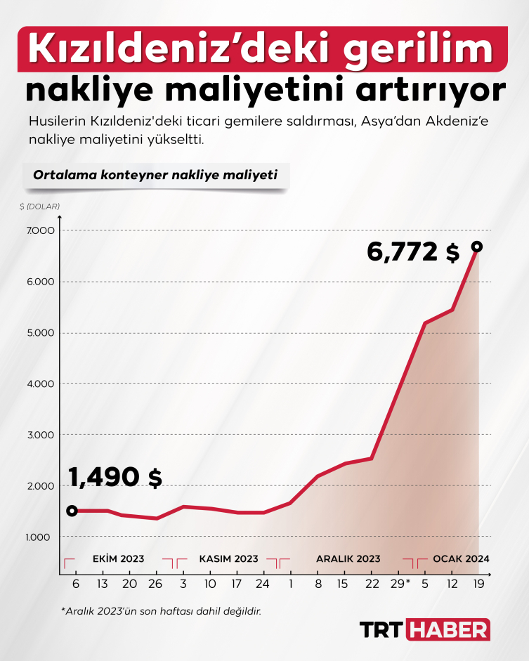 Kargo rezervasyon şirketi Freightos'a göre ise Çin'den Akdeniz'e konteyner nakliyesinin maliyeti kasım ayının sonundan bu yana dört kattan fazla arttı.