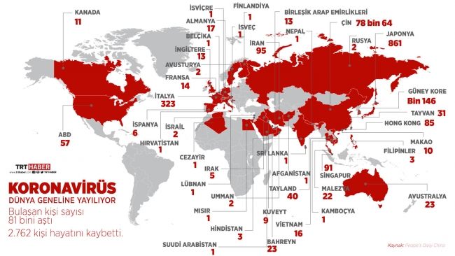 Çin ana karasında 2 bin 715, Hong Kong Özel İdari Bölgesi'nde 2, İran'da 15, Güney Kore'de 11, İtalya'da 11, Japonya'da 5, Tayvan, Filipinler ve Fransa'da da birer kişi yeni tip koronavirüs nedeniyle hayatını kaybetti.