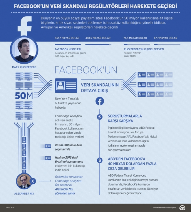 Sosyal paylaşım sitesi Facebook'un 50 milyon profil verisini, ABD Başkanı Donald Trump'ın 2016 seçim kampanyası döneminde ve Brexit'te (İngiltere'nin AB'den ayrılma süreci) analiz ve manipülasyon için izinsiz paylaştığı iddia edilmişti. Cambridge Analytica’nın yazılımcılarından Christopher Wylie'nin iddiaları, hem ABD hem de İngiltere basınında geniş yankı uyandırmıştı.