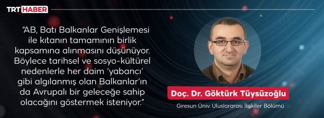 Doç. Dr. Göktürk Tüysüzoğlu önce madalyonun AB tarafını ele alıyor… “AB, Batı Balkanlar Genişlemesi ile kıtanın tamamının birlik kapsamına alınmasını düşünüyor” bilgisini paylaşıyor.