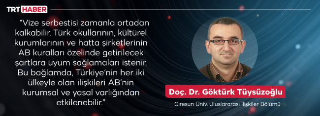Bahsettiğimiz vize serbestisi zamanla ortadan kalkabilir. Türk okullarının, kültürel kurumlarının ve hatta şirketlerinin AB kuralları özelinde getirilecek şartlara uyum sağlamaları istenir. Bu bağlamda, Türkiye’nin her iki ülkeyle olan ilişkileri AB’nin kurumsal ve yasal varlığından doğrudan etkilenebilir. Bu durum, ilişkilerde AB’den bağımsız adım atılmasını mümkün olmayan bir bağlama itecektir.
