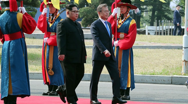 Moon ile bir süre yürüyüş yapan Kim, akabinde Güney Kore askerlerinden oluşan ve şeref kıtası olarak da bilinen tören mangasını selamladı.