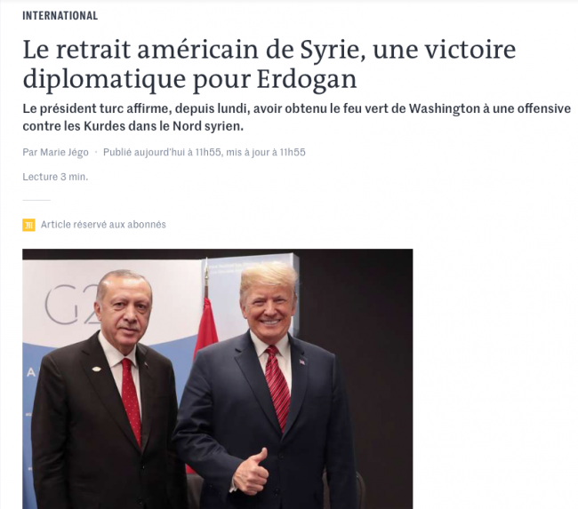 Fransız Le Monde gazetesi, "Türkiye Cumhurbaşkanı Erdoğan için diplomatik zafer" başlığıyla yayımladığı haberde, ABD'nin Suriye'den çekilme kararını değerlendirdi.