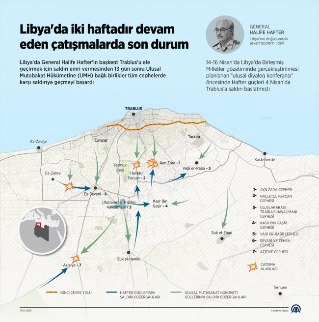 Öte yandan Hafter'in ilk darbesini aldığı Zaviye kenti sınırındaki sahil cephesi ya da Trablus'un doğusundaki Kastelverde (Karabolulu) üzerinden Misrata'dan gelen destekleri kesmek üzere bir cephe açılması da ihtimal dahilinde değerlendiriliyor.