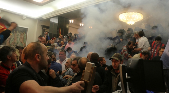 VMRO-DPMNE yanlısı grubun meclis önündeki protestosu başladıktan kısa bir süre sonra maskeli bir grup protestocunun parlamento binasına girerek rehin aldığı milletvekilleri de dahil meclisteki herkesin tahliye edildiği, binanın tamamen boşaltıldığı öğrenildi.