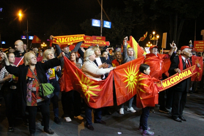 Başkent Üsküp'teki meclis binası önünde toplanan yüzlerce kişi, "referandumun başarısızlığını" kutladı.