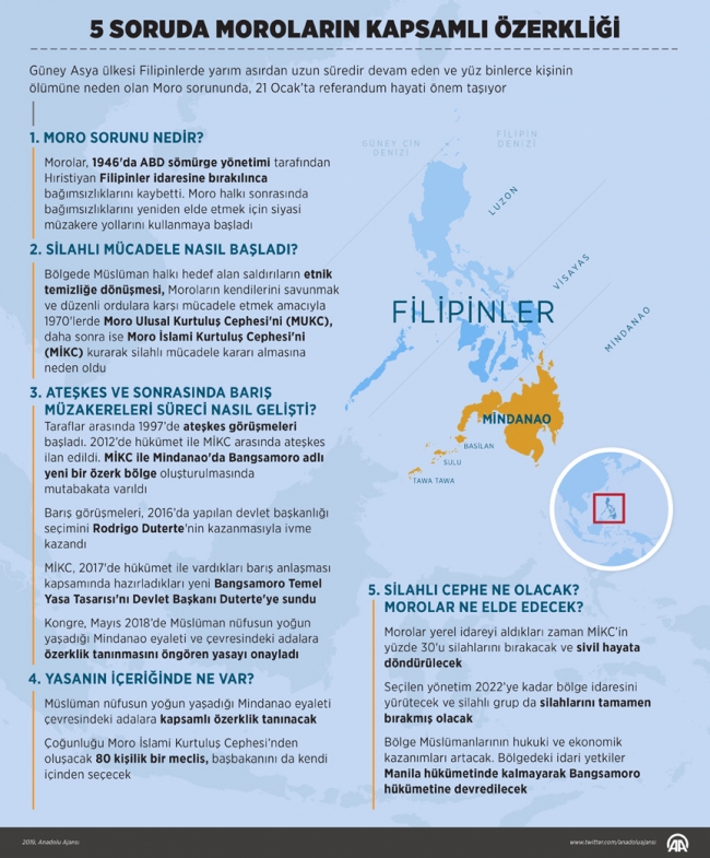Yüzyıllardır sahip oldukları özgürlükleri 1898'de Amerikalılar, ardından 1946'da Filipinliler tarafından alınan Morolar, Temmuz 2018'de Manila hükümetiyle imzalanan kapsamlı özerklik anlaşmasında son aşamaya geldi.