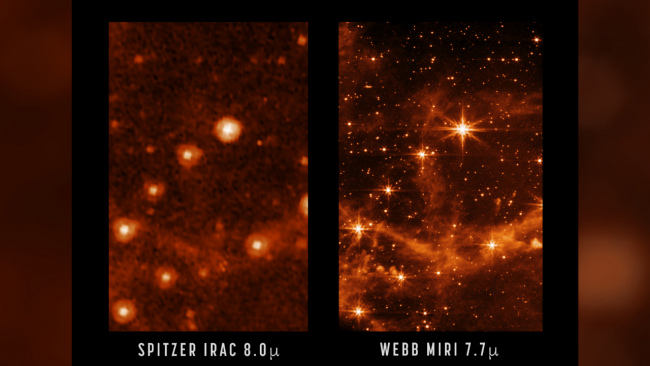 Öte yandan NASA, James Webb Uzay Teleskobu'nun elde ettiği bir görüntüyü, Spitzer Uzay Teleskobu tarafından kaydedilen görüntüyle yan yana getirdi.