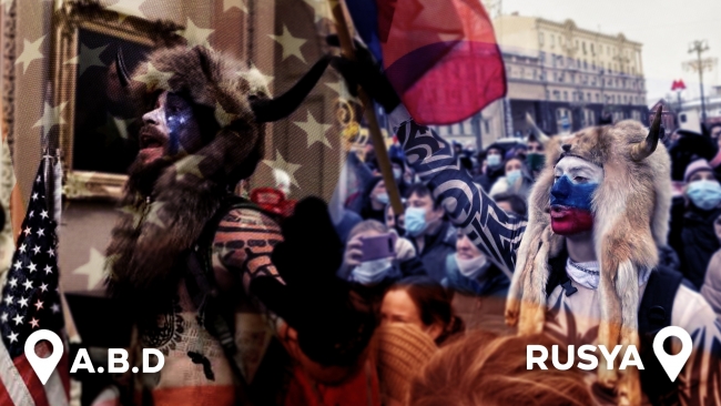 Şaman kostümü ve Rus bayrağına boyanmış yüzüyle dikkat çeken adam, ABD'de Kongre baskını sırasında giydiği kıyafetle 'baskının yüzü' haline gelen QAnon Shaman'ı akıllara getirdi.
