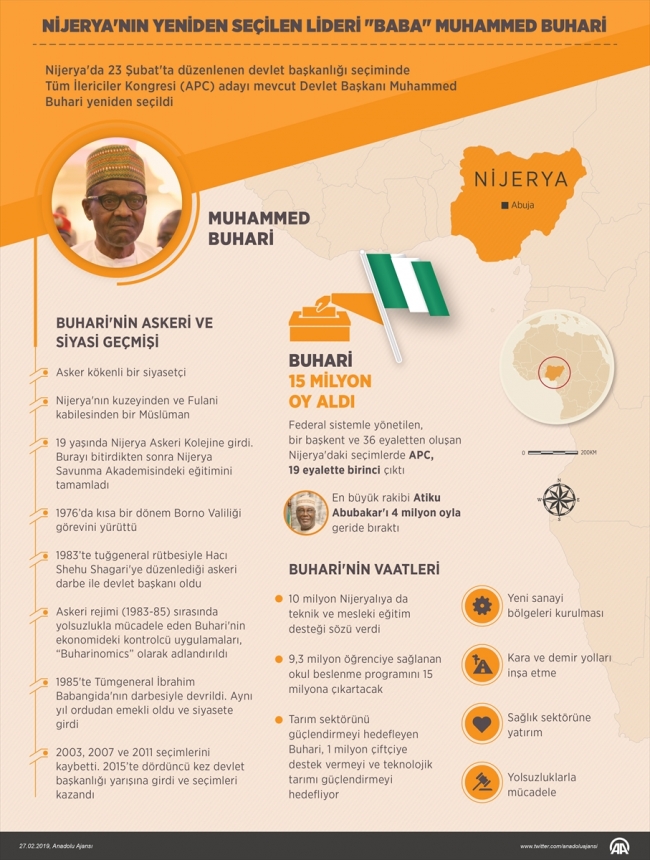 Nijerya'da 23 Şubat'ta düzenlenen devlet başkanlığı seçiminde Tüm İlericiler Kongresi (APC) adayı mevcut Devlet Başkanı Muhammed Buhari yeniden seçilmişti.
