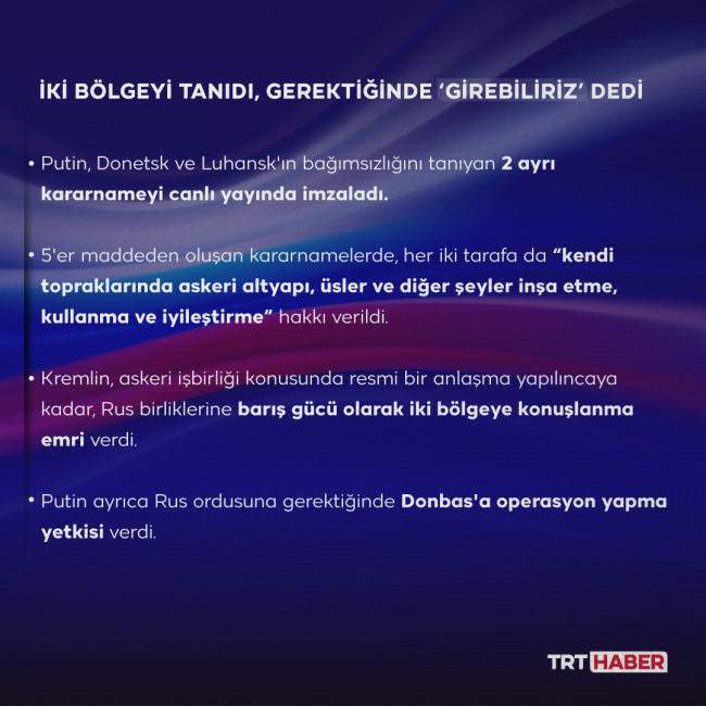 5'er maddeden oluşan kararnamelerde, Putin'in Rusya Silahlı Kuvvetlerine sözde Donetsk ve Luhansk halk cumhuriyetlerinde barışın korunması için faaliyetlerde bulunması talimatını verdiği belirtildi.