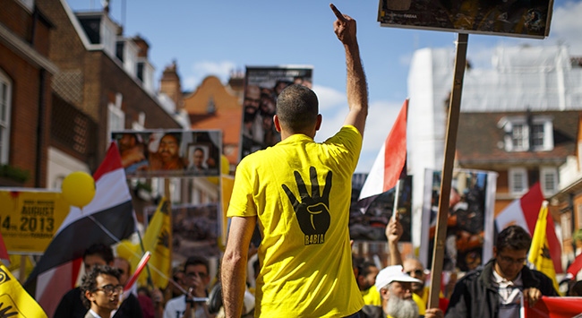 Mısır'da 14 Ağustos 2013'te yaşanan Rabia katliamının 3'üncü yılı dolayısıyla Birleşik Krallık'ın başkenti Londra'da gösteri düzenlendi. Marble Arch Meydanı'nda toplanan göstericiler, Mısır'daki askeri rejimin Cumhurbaşkanı Abdulfettah Sisi'yi protesto etti. Sisi’yi temsil eden asker üniformalı bir kukla taşıyan göstericiler, darbeyle görevden uzaklaştırılan ülkenin seçilmiş ilk cumhurbaşkanı Muhammed Mursi'ye destek içeren sloganlar attı.