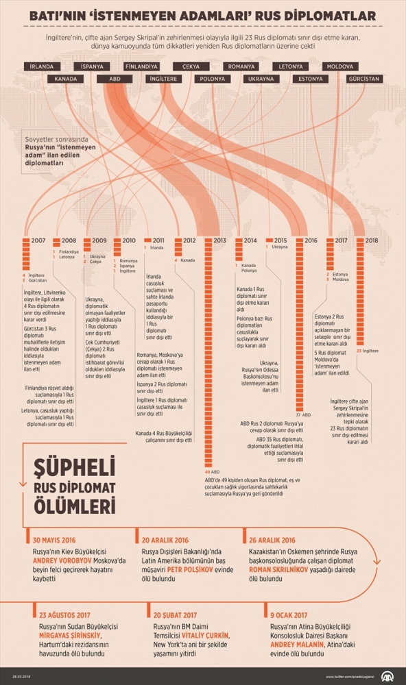 Cuma günü 23 ülkeden 59 diplomatı sınır dışı etti. Ardından bu sayıya 50'den fazla İngiliz diplomatı da eklendi. Bu diplomatlara da ülkeyi terketmeleri için 1 ay süre tanıdı.