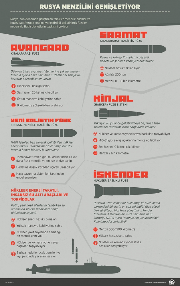 Devlet Başkanı Vladimir Putin'in açıkladığı ve "yenilmez" olarak tanımladığı silahlar, dünyadaki silahlanma yarışının geldiği yeri bir kez daha gösterdi. Ruslar, mevcut silahlarının menzilini artırmanın yanı sıra, dünyanın herhangi bir noktasını vurabilecek yeni nesil silahları test ettiklerini duyurdu.