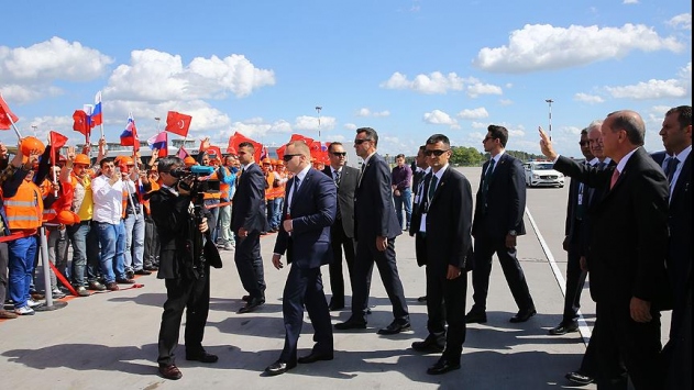 Karşılamaya katılan Rusya'da çalışan Türk işçiler, ellerindeki Türk ve Rus bayraklarıyla "Dik dur eğilme bu millet seninle", "Türkiye seninle gurur duyuyor" şeklinde slogan atarak Erdoğan'a sevgi gösterisinde bulundu.