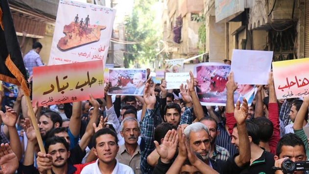 Esed rejimine destek veren Rusya Devlet Başkanı Vladimir Putin'in posterlerini yakan bazı göstericiler, ''Rusya, Suriye halkının düşmanıdır. Putin Halep'i yakıyor'' dövizleri taşıdı.