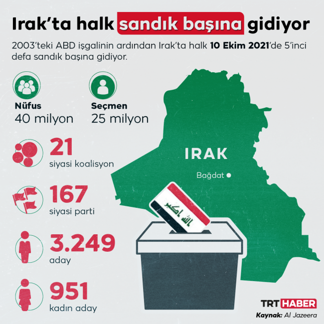 40 milyon nüfuslu Irak’ta 25 milyon seçmen bulunuyor. Yetkililerin açıklamalarına göre, seçmenlerin yüzde 90’ından fazlası seçimlere kaydını yaptırdı. Ancak seçimlere katılımın yüzde 50’nin altında olması bekleniyor.