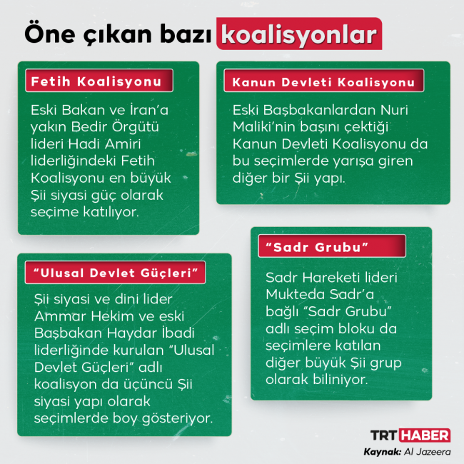 Ülkedeki, ilk koalisyon, Mukteda es-Sadr'ın yakın zamanda yeniden düzenlenen koalisyonu. Nasıriyye kentinde COVID-19 hastalarının kaldığı bir hastanede çıkan ve onlarca kişinin hayatını kaybetmesine ve yaralanmasına neden olan yangının ardından Sadr, seçimleri protesto ederek, hareketinin seçimlerden çekildiğini açıklamıştı. Bu hastaneyi işleten Sadr Hareketi'ne mensup yetkililer, Sadr'ın destekçileri olarak Irak Sağlık Bakanlığını kontrol ediyor.