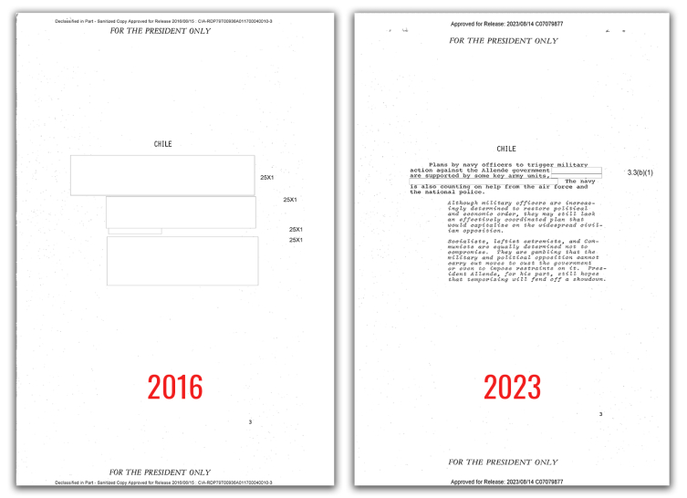 ABD Ulusal Güvenlik Arşivi'nin 2022'de yaptığı açıklamada, darbeden 3 yıl önce Nixon'ın, Allende'nin göreve başlamasını engellemek amacıyla askeri bir darbe başlatarak "Şili'nin kurtarılması" yönünde emir verdiğini belirtmişti.