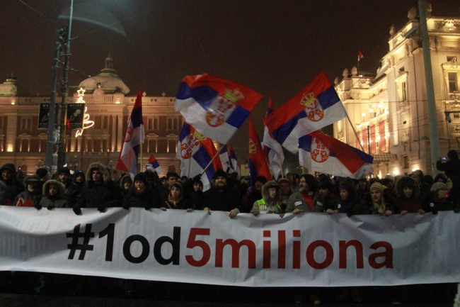 Sırbistan'da bu hafta beşincisi düzenlenen protestoya katılan göstericiler, "5 milyondan yalnızca biri", "kanlı gömleklere son", "çalınan emekli maaşlarını geri verin", "ordu ve polis hainliği bırakıp anayasa ve halkın yanında dursun" yazılı dövizler taşıdı.
