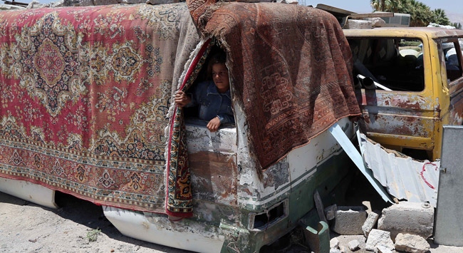Suriye'deki iç savaşta, rejimin saldırılarından kaçarak başkent Şam'ın Doğu Guta bölgesine sığınan aileler, 45 dereceye kadar çıkan sıcaklarda boş arazilere kurdukları çadırlarda ve hurda arabalar arasına örttükleri halı ve kilimlerin gölgesinde yaşam mücadelesi veriyor.