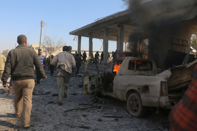 [PKK/YPG, Tel Abyad’ın sanayi bölgesinde sivil halka bombalı araçla saldırdı. İlk bilgilere göre 3 kişi katledildi, 20’den fazla kişi yaralandı. Saldırı sonucu bölgedeki araçlarda yangın çıktı. Fotoğraf: AA]