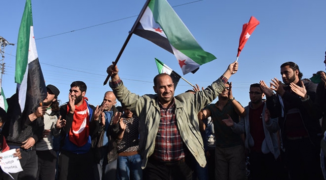 Ellerinde Türk ve ÖSO bayrağı taşıyan göstericiler, "Türk Silahlı Kuvvetlerinin desteğindeki Özgür Suriye Ordusunun Tel Rıfat'a harekatını dört gözle bekliyoruz", "Türk askerine ve sayın Recep Tayyip Erdoğan'a Zeytin Dalı Harekatından dolayı şükranlarımızı sunuyoruz" yazılı pankartlar açtı.