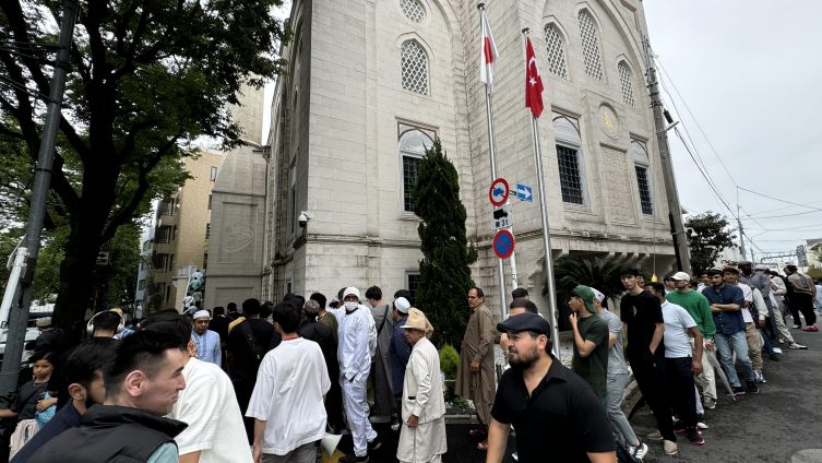 Yoğun kalabalık, Tokyo Camii'ni çevreleyen sokaklarda, bayram namazına yetişebilmek amacıyla sıraya girdi.