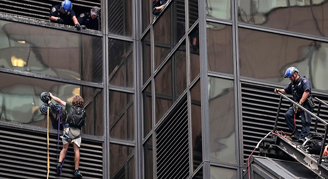 Virginia eyaletinden olduğu belirtilen 20 yaşındaki genç, Trump'ın seçim kampanya merkezi olarak kullandığı 58 katılı gökdelende birkaç saat süren tırmanışının ardından 21. katta polis zoruyla eylemini bitirdi.