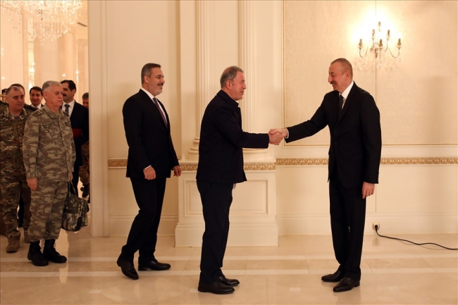 Azerbaycan Cumhurbaşkanı İlham Aliyev, Dışişleri Bakanı Mevlüt Çavuşoğlu, Milli Savunma Bakanı Hulusi Akar, Kara Kuvvetleri Komutanı Orgeneral Ümit Dündar ve Milli İstihbarat Teşkilatı (MİT) Başkanı Hakan Fidan'ı kabul etti.