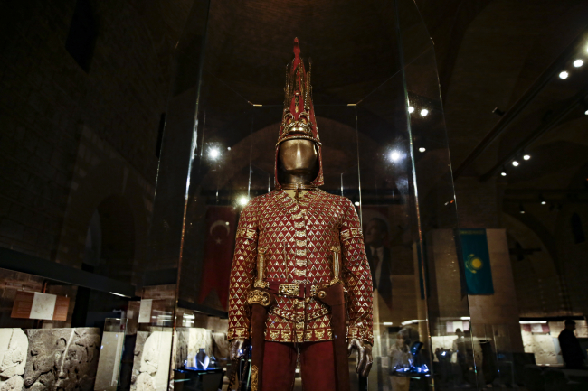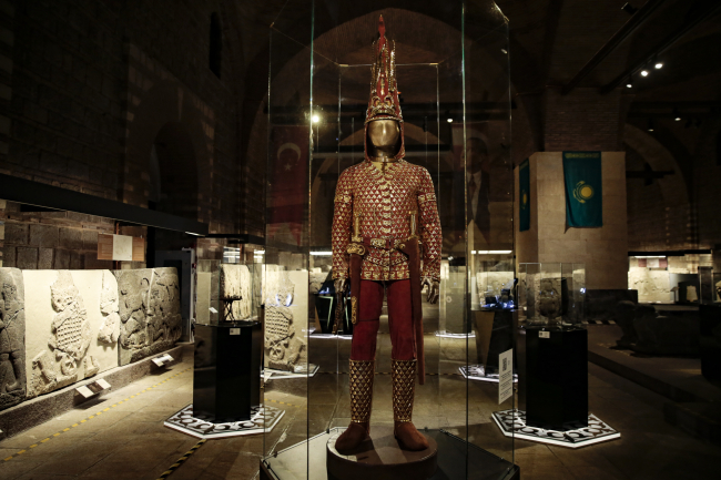 [Fotoğraf: AA]Tigin’in deri kaftan ceketi, sağdan sola doğru kapanan v yakalı, uçları yukarıya dönük, alt uçları birbirile ile temas eden yüzlerce üçgen altın levhanın birbirine geçirilmesiyle pullu formda olup adeta altından zırh şeklinde dokunmuş. Zırh, plakaların kenarlarına açılan deliklerden altın ip geçilerek birbirine tutturulmuş olup gömlek sola doğru düğmeleniyor. Kaftanın yakası, omuz hizası, kolun alt taraflarına dörtgen şeklindeki plakalara bezenmiş yırtıcı pars figürü ile süslenmiş.