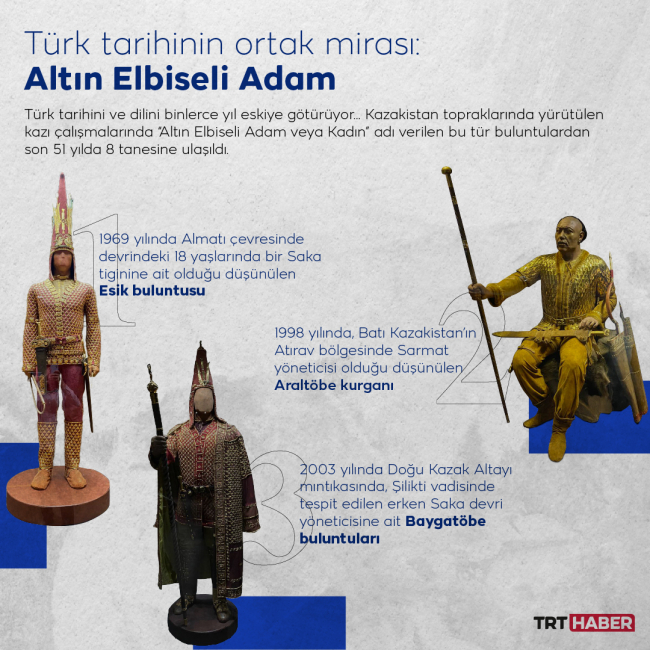 Kazakistan topraklarında yürütülen kazı çalışmalarında “Altın Elbiseli Adam veya Kadın” adı verilen bu tür buluntulardan son 51 yılda 8 tanesine ulaşıldı. Serhan Çınar, Altın Elbiseli buluntuların şu ana kadar 6 tanesinin erkek, 2 tanesinin ise kadınlara ait olduğunu söyledi.