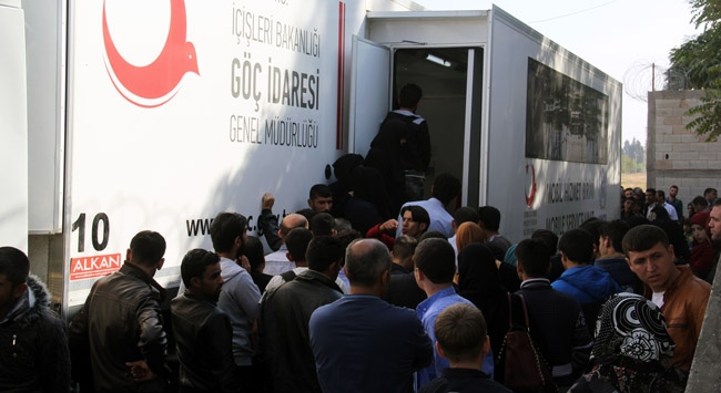 Gaziantep Valiliği görevlileri tarafından Karkamış ilçesinde kayıt işlemleri yapılan Suriyeliler, Göç İdaresi İl Müdürlüğü ekiplerinin nezaretinde, yanlarına aldıkları eşya ve bavullarıyla güvenlik kontrolünden sonra Cerablus'a gönderiliyor.