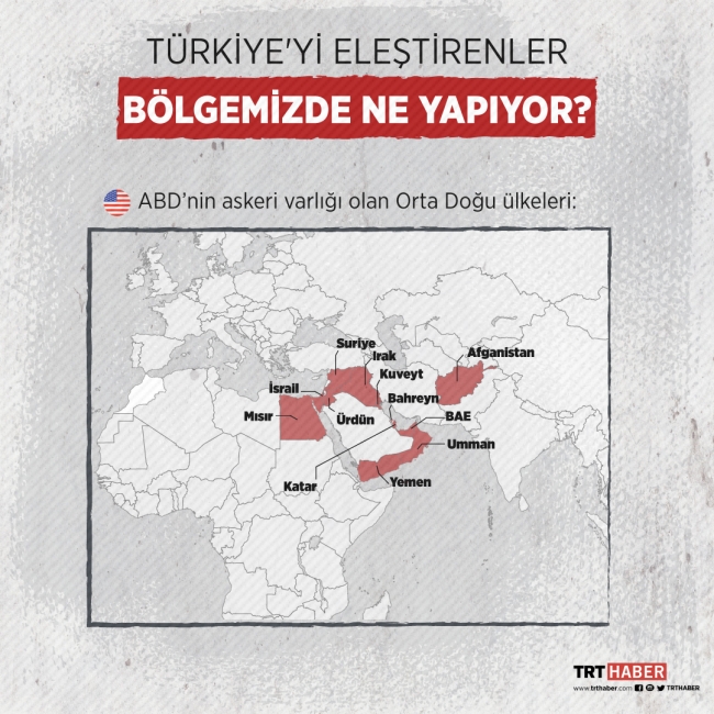 Tüm bunların yanı sıra Yemen'de de özel birlikler konuşlandıran ABD, Umman'daki havaalanları ile limanları da kullanma hakkına sahip. ABD’nin, 9 yıldır savaşın pençesinden kurtulamayan Suriye'de ise 18 askeri üssü var.