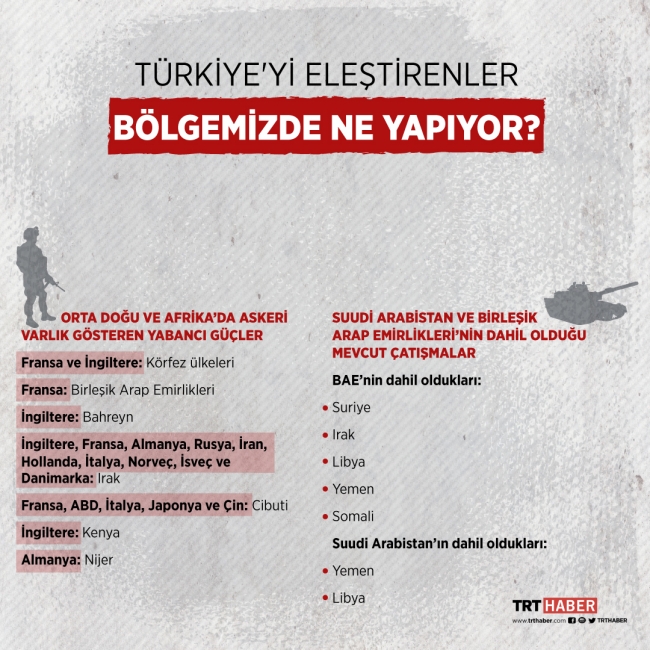 Yabancı güçlerin Orta Doğu'daki askeri varlığından rahatsızlık duymayan bazı Arap yönetimlerinin ise, Türkiye'nin meşru müdafaa hakkını kullanarak yaptığı terörle mücadele operasyonlarına karşı çıkması dikkat çekiyor.