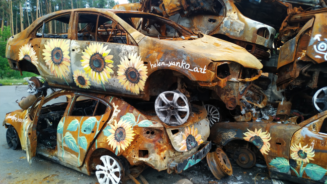 Rusya-Ukrayna savaşı devam ederken, Ukrayna ordusu tarafından ülkenin Irpin şehrinde Rus tanklarının ilerlemesini durdurmak için yıkılan bir köprüden çekilen araçlar, ABD’li ve Ukraynalı sanatçıların tuvali oldu.