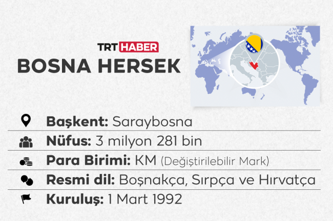 [Grafik: TRT Haber / Şeyma Özkaynak]51 bin 197 kilometrekarelik yüz ölçümüne sahip Bosna Hersek’te, birbirleriyle neredeyse aynı olan 3 resmi dil (Boşnakça, Sırpça ve Hırvatça) kullanılıyor.