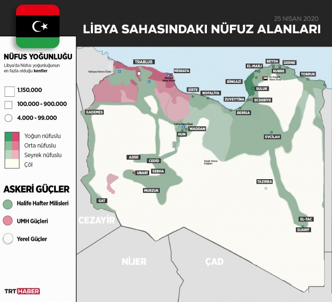 [Halife Hafter'in Trablus'a yönelik başlattığı saldırıda ilk başta başkenti neredeyse çevrilemeye başardı...Harita, 25 Nisan 2019'daki saha durumunu gösteriyor.]Bu aşamada, Trablus'un güney çevresinden ülkenin orta kesimindeki Sirte ve Cufra bölgelerine geri çekilen zırhlı araçlardaki Rus paralı milislerin görüntüleri kameralara yansıdı.