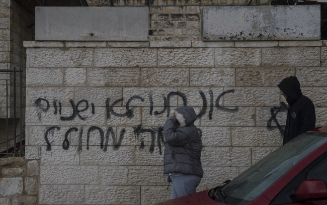 İsrail polisinden yapılan yazılı açıklamada, Pisgat Zeev Yahudi Yerleşim Birimi yakınında "araçlara verilen zarar ve evlerin duvarlarına yazılan sloganlarla" ilgili soruşturma açıldığı ve zanlıların arandığı belirtildi.