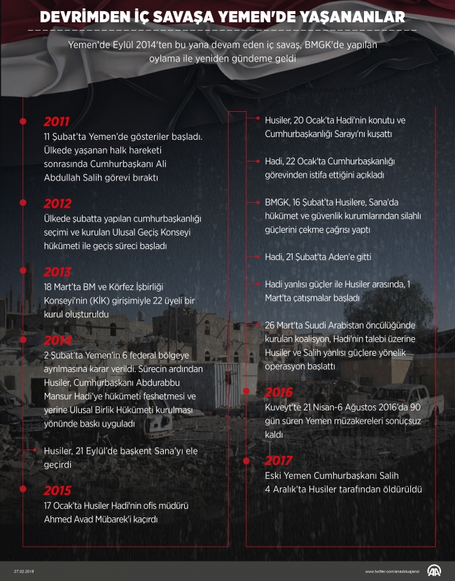 Uzun süredir siyasi istikrarsızlığın yaşandığı Yemen'de meşru yönetime darbe yapan Husiler, 2014'ten bu yana başkent Sana ve bazı bölgelerin denetimini elinde tutuyor. Suudi Arabistan öncülüğündeki koalisyon güçleri ise, Mart 2015'ten bu yana Yemen hükümetine destek veriyor.