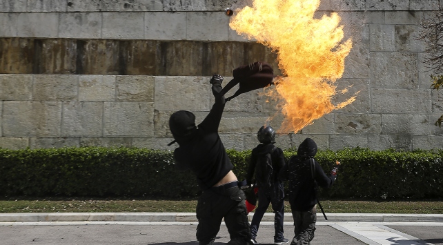 Öğrencilerin, başkent Atina'daki Sintagma Meydanı'nda eğitim sistemindeki değişikliklere karşı düzenlediği gösteride yüzleri maskeli bir grup, parlamentonun bahçesine molotofkokteyli attı.