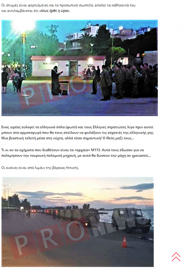 İlgili haberlerde, papazların da limanlardaki gemilere binmeden önce Yunan askerleri dini ayinlerle kutsadıkları ileri sürüldü. Hem Eleftheri Ora Gazetesi hem de Yunan Pronews haber sitesi, adalara sevk edilen tankların, zırhlı araçların, askerlerin ve yapılan kutsama ayinlerinin fotoğraflarını da yayımladı.