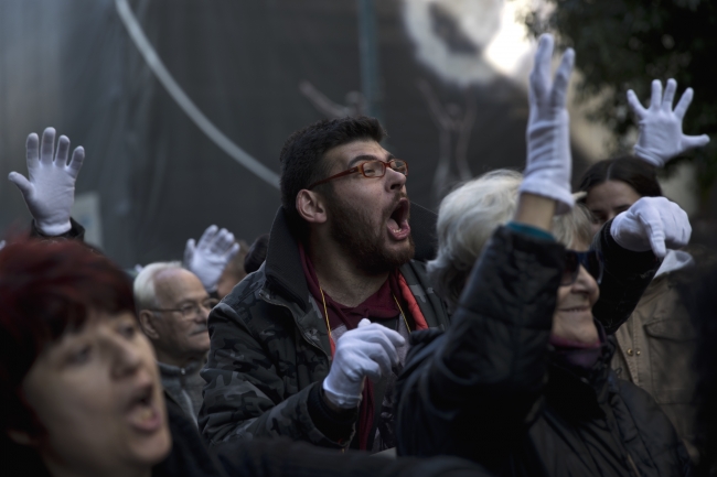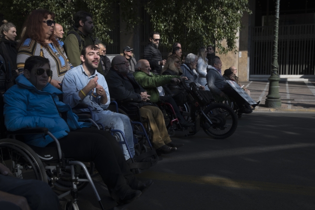 "3 Aralık Dünya Engelliler Günü" kapsamında, Yunanistan'ın farklı bölgelerinden bir araya gelen yüzlerce engelli, önde tekerlekli sandalyeli vatandaşlarla Sintagma Meydanı'na yürüdü.