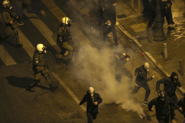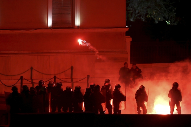 Yunanistan Başbakanı Aleksis Çipras'ın Meclis'teki konuşması sırasında, bir grup göstericinin taş ve havai fişeklerle saldırısına polis göz yaşartıcı gaz ve ses bombalarıyla karşılık verdi.