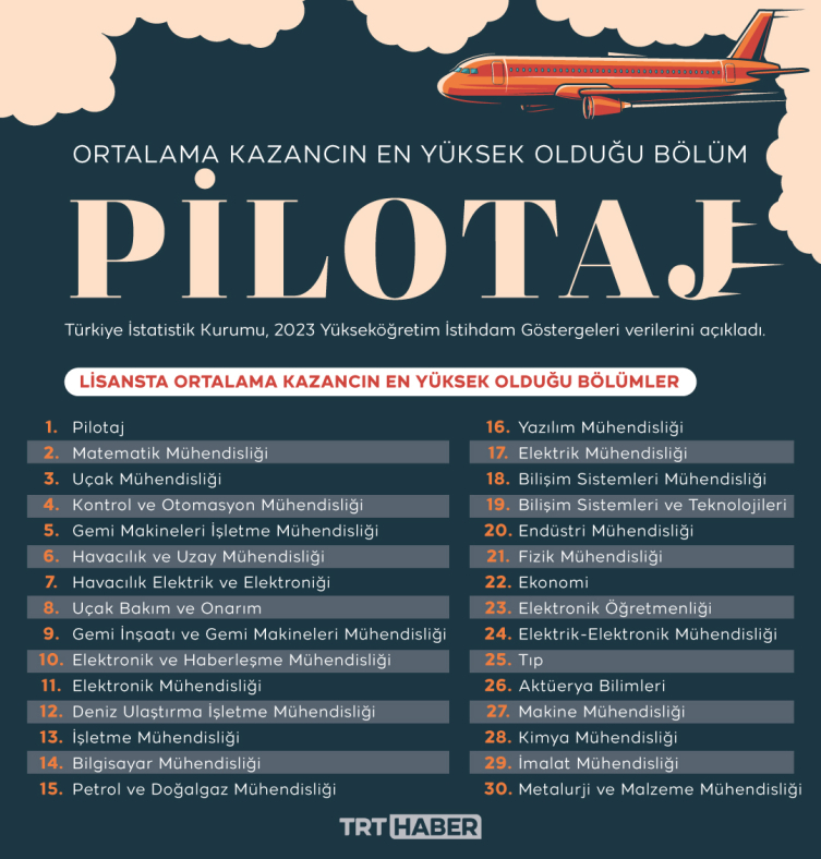 Lisans mezunlarının kazanç durumları incelendiğinde, aylık ortalama kazancı en yüksek 5 bölümün sırasıyla pilotaj, matematik mühendisliği, uçak mühendisliği, kontrol ve otomasyon mühendisliği, gemi makineleri işletme mühendisliği olduğu görüldü.
