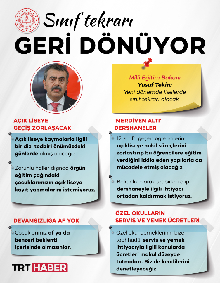 Bakan Tekin, yardımcı kitaplar, seçimlik dersler gibi bazı konularla yaptıkları çalışmayı yakın zamanda kamuoyuyla paylaşacaklarını vurgulayarak, “Özellikle okul terkleriyle ilgili yaşanan sorunlar var, onlarla ilgili değişiklikler eğitim öğretim yılı başlamadan önce ilgili mevzuat değişiklikleriyle kamuoyuyla paylaşılmış olacak. Aynı şekilde özellikle ortaöğretim kurumlarındaki öğretmen arkadaşlarımızın çok dile getirdikleri hususlar oldu. Bunlardan bir tanesi, özellikle liselerde sınıf tekrarının olmamasının kaynaklanan sorunlardan söz edildi. Bu zaten bizim de gündemimizdeydi, dolayısıyla bununla ilgili bir tedbir alacağız, yeni dönemde sınıf tekrarının mümkün olduğu bir süreç söz konusu olacak” bilgisini paylaştı.