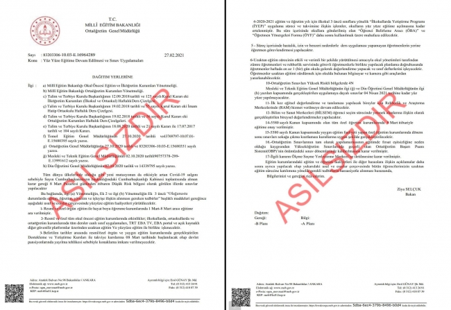 "Sosyal medyada ve anlık mesajlaşma uygulamalarında dolaşıma sokulan "Yüz Yüze Eğitime Devam Edilmesi ve Sınav Uygulamaları" konulu belge görseli asılsızdır."