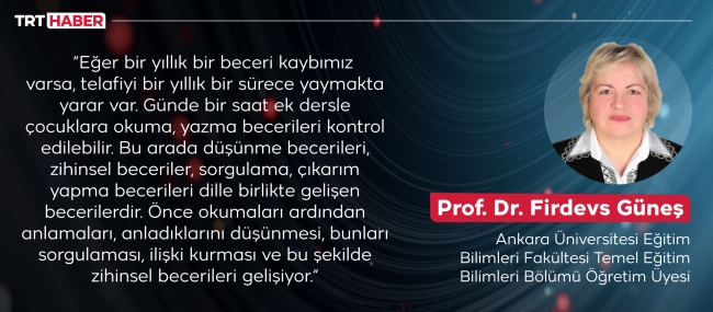 Uzaktan eğitimle dil ve sayısal becerilerin geliştirilemediğine, becerinin uygulayarak gelişebileceğine dikkat çeken Prof Dr Firdevs Güneş, "Bilgi kaybını kapatabiliyoruz ama konuşma, okuma, yazma becerilerini bir günde geliştiremeyiz. Bunun için bir süre gerekiyor" diye konuştu.