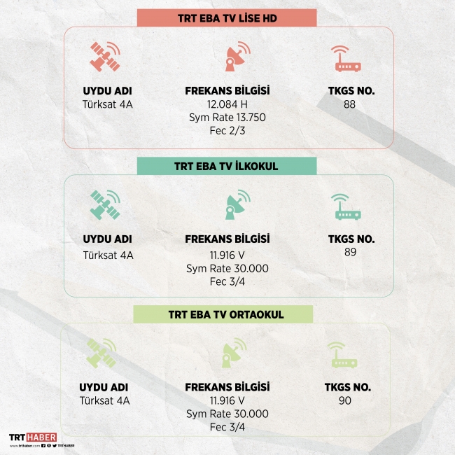 TRT-EBA TV İlkokul, TRT-EBA TV Ortaokul ve TRT-EBA TV Lise olmak üzere 3 kanal uzaktan eğitimde kullanılacaktır.