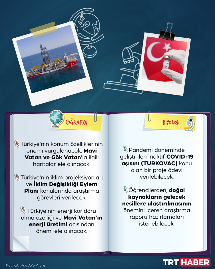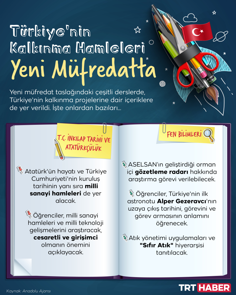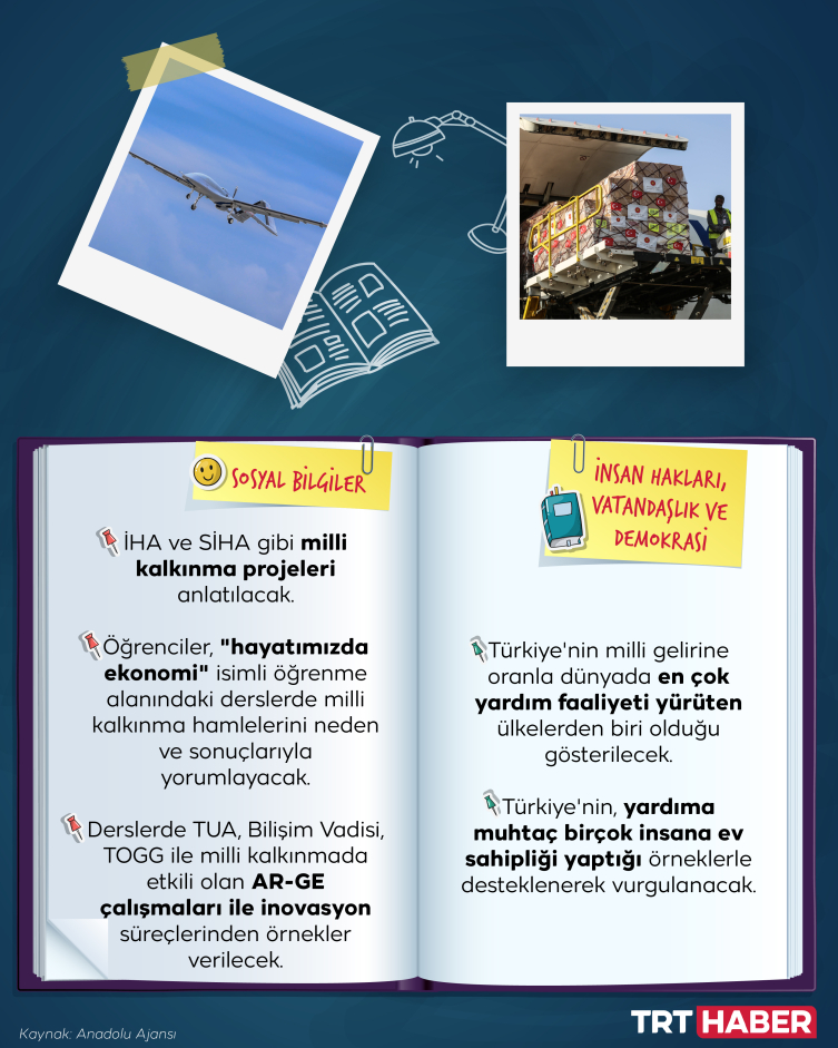 Ortaokul 7. sınıf sosyal bilgiler dersinde ise öğretme-öğrenme uygulamaları kısmında; Türkiye'nin ilk astronotu Alper Gezeravcı ile İHA ve SİHA gibi milli kalkınma projeleri anlatılacak.